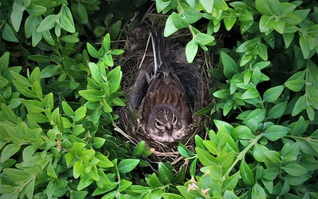 Moineau couvant les oeufs dans un buis à Mahéru - 19 Juin 2021 - E.L